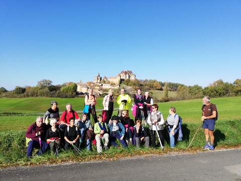 ** Samedi 17 novembre : 19 nous étions derrière Huguette pour 11 kms 5 sur les chemins autour du château de Biron. Soleil, douceur, beaux sous-bois, pas de difficultés majeures, un bon moment quoi ! D'autant plus que notre guide avait pris soin de contacter le responsable de la société de chasse locale pour lui signaler notre présence. Ce monsieur a appelé vers 9 h pour confirmer leur position à l'opposé de notre itinéraire. Merci à Huguette pour cette initiative et merci à cette personne pour sa réaction encourageante .... Le repas à l'auberge du château nous a permis de prolonger notre rando autour d'une bonne table. Belle journée Huguette, tu peux être satisfaite.